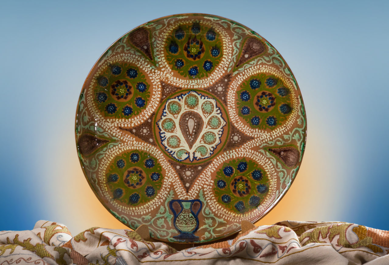 “Dastagul” nomli lagan. 980-1000 gradus haroratda kulolchilik pechi-xumdonda pishirilganligi sababli, issiq va sovuqqa chidamli hisoblanadi. Gʼijduvon anʼanaviy kulolchiligida 8 xil turli xil ranglardan foydalaniladi.